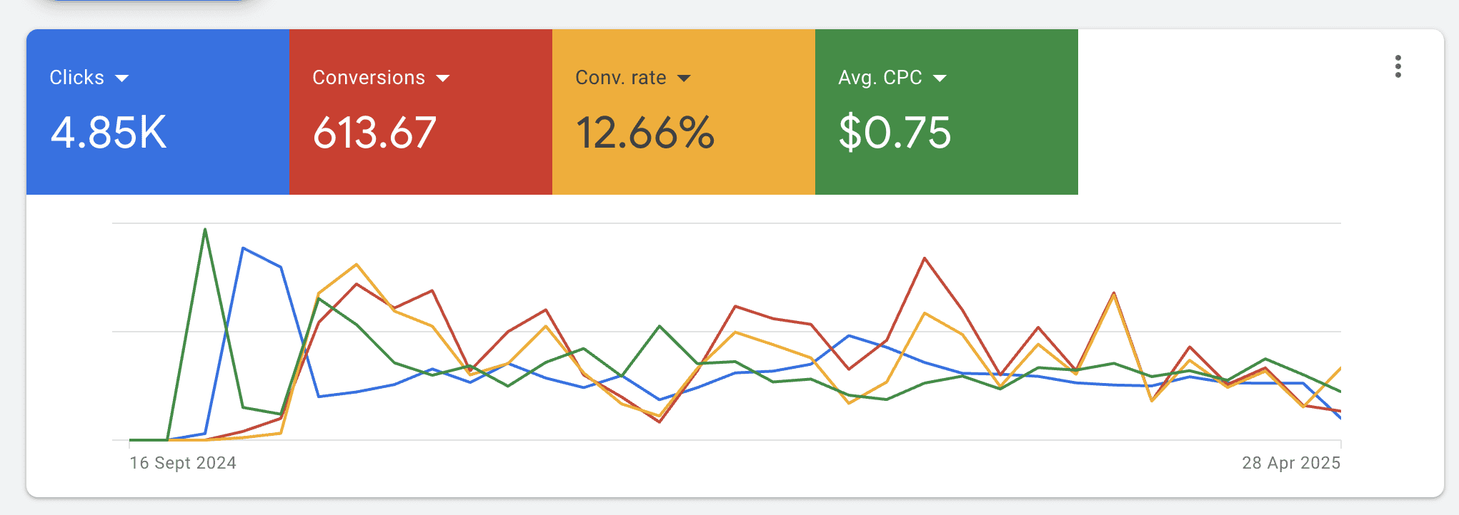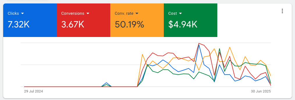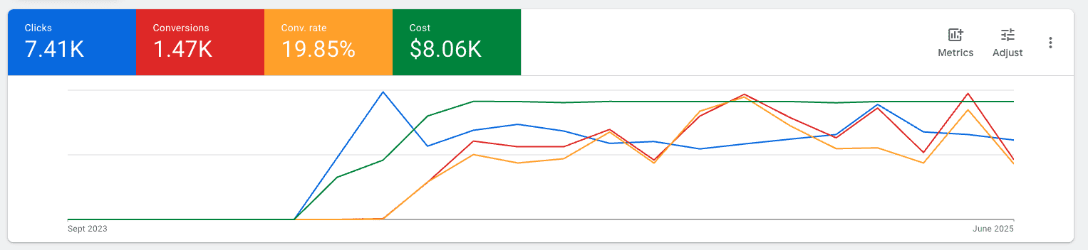 From September 2024 to May 2025, this pilates studio’s Google Ads performance turned around dramatically. Conversion rates jumped from a poor 0.2% to a strong 12.65%—a massive 6230% improvement in turning clicks into actual sign-ups. At the same time, cost per click dropped from $1.23 to just $0.76, cutting ad spend by over 38% while increasing results.
